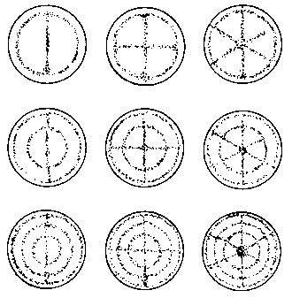 Hladni figūras, atkarībā no svārstību frekvences un plāksnītes svārstību veida.